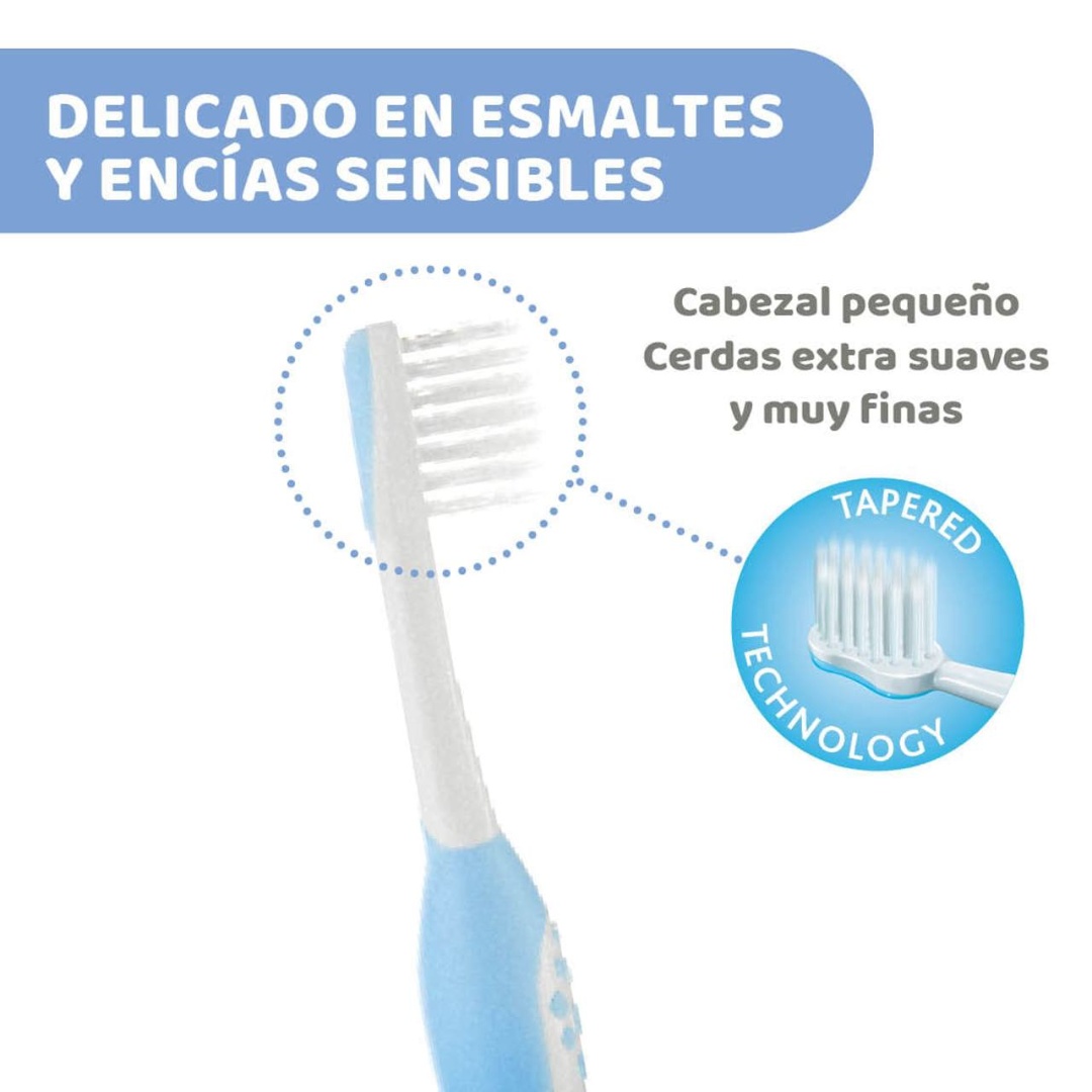 Seguro y eficaz cuidado de encías y dientes de leche con suaves cerdas cónicas.