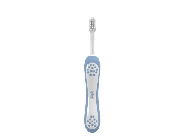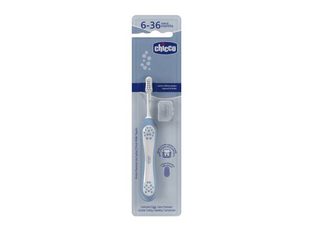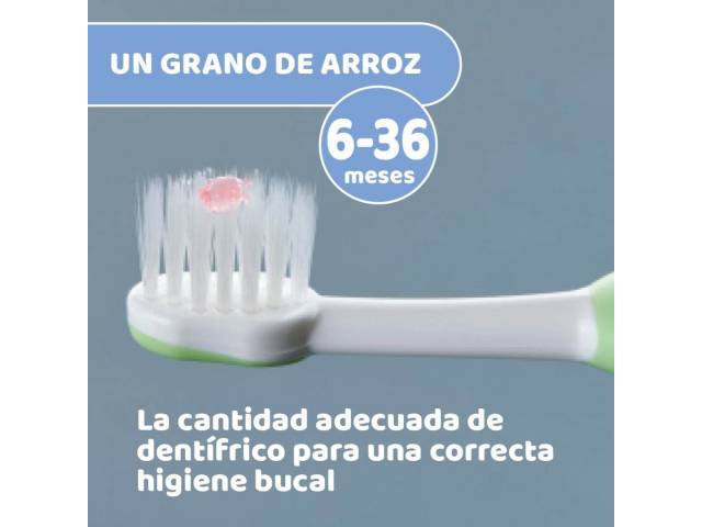 Cepillo dental Chicco para bebés y niños pequeños (6–36 meses). Con empuñadura ergonómica antideslizante, cabeza pequeña y cuello delgado para una limpieza cómoda desde los primeros meses.